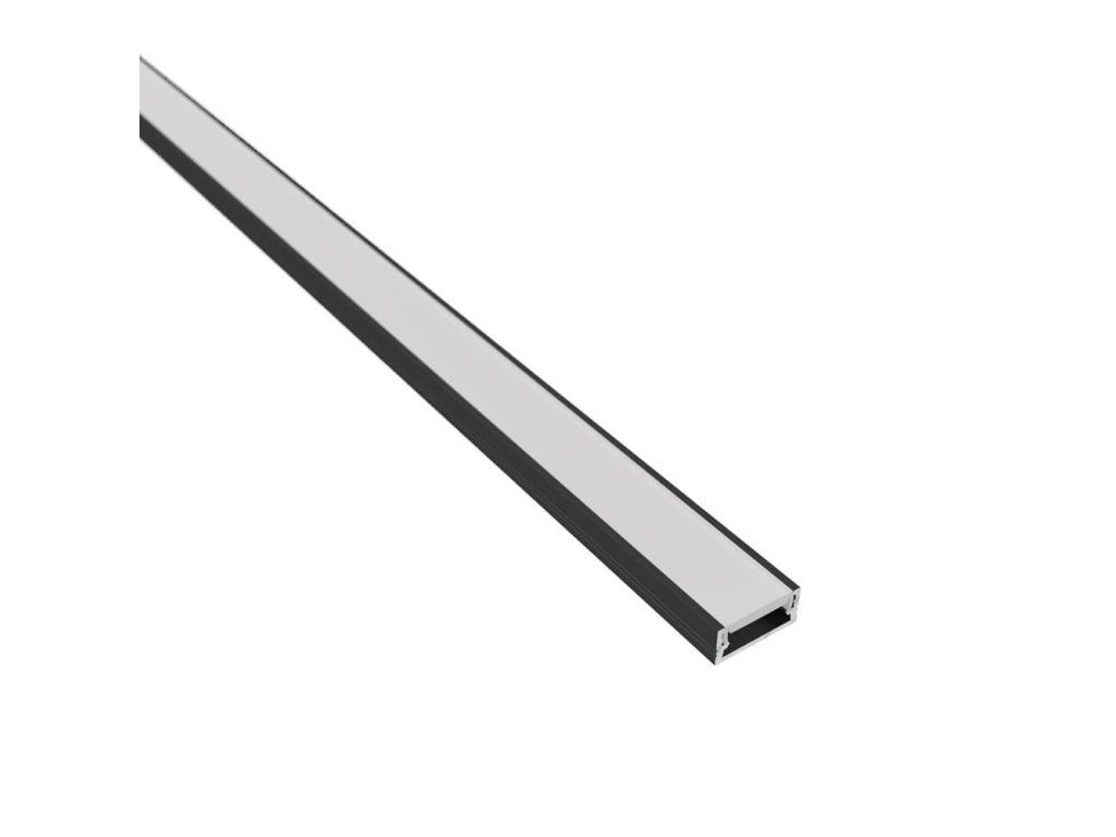Černý hliníkový profil v délce 2000 mm s mléčným difuzorem.