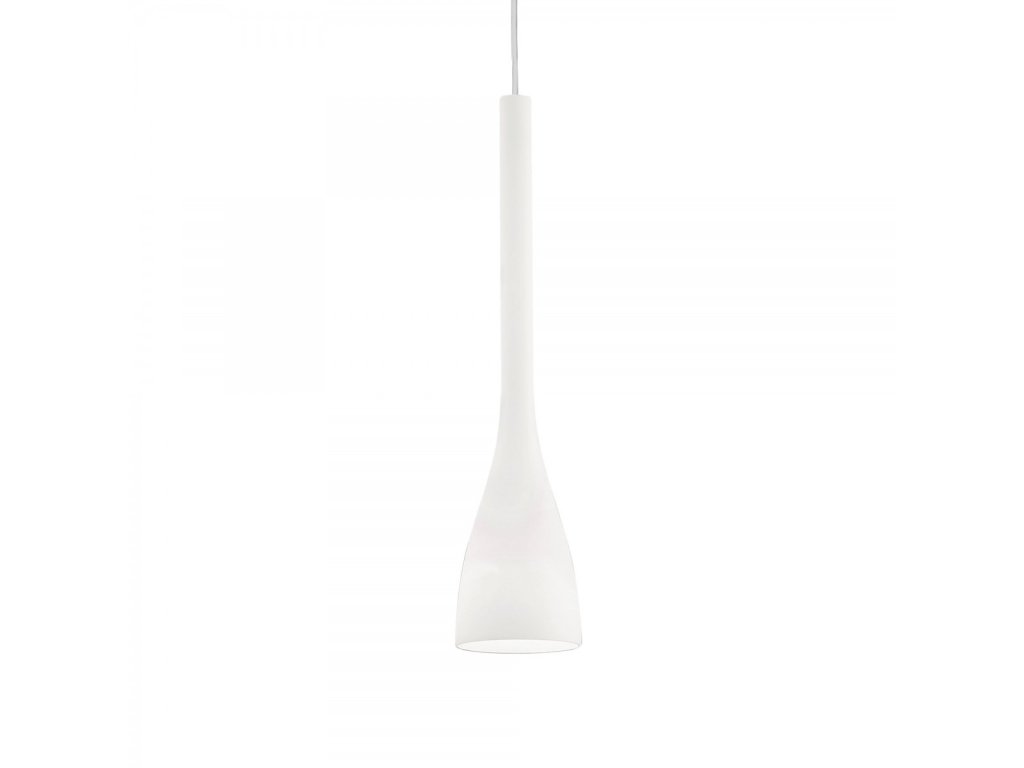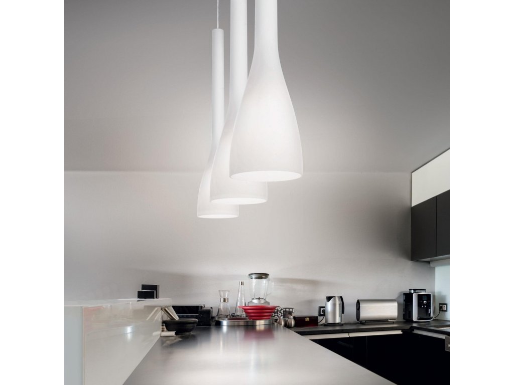 Závěsný lustr z foukaného mléčného skla. Krásně štíhlé linie stínidla bez jakýchkoliv doplňků dodávají svítidlu jemnou eleganci a ušlechtilost.