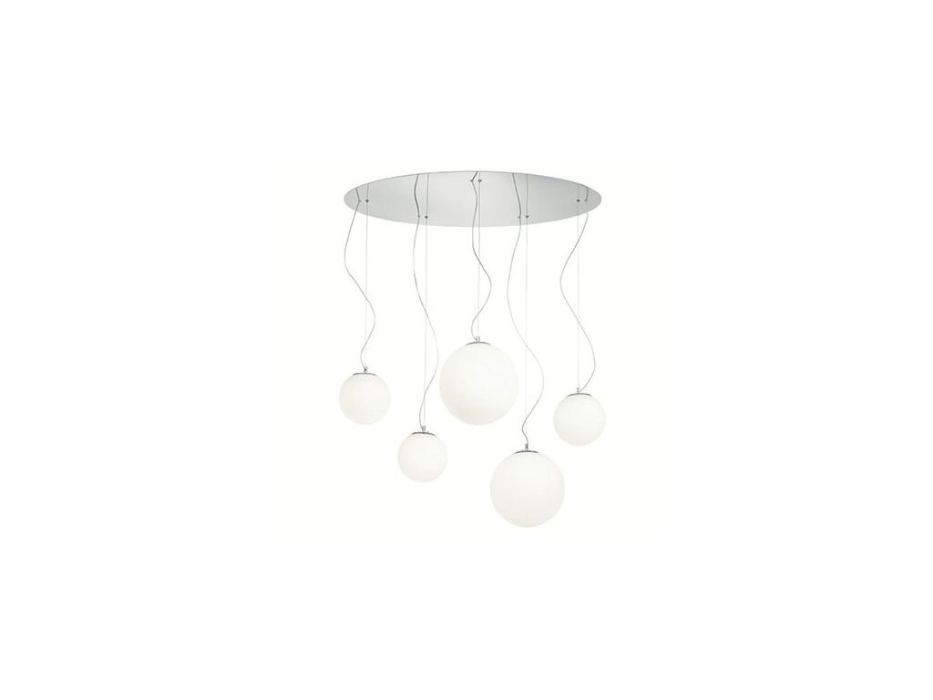 Letící míče nebo snad vesmírná tělesa na noční obloze? Stačí popustit uzdu fantazii a další přirovnání vyvstanou na mysli při pohledu na bílé koule zavěšené na ocelových lancích, která tvoří sice jednoduchý, avšak o nic méně vkusný lustr hodící se do každého interiéru.