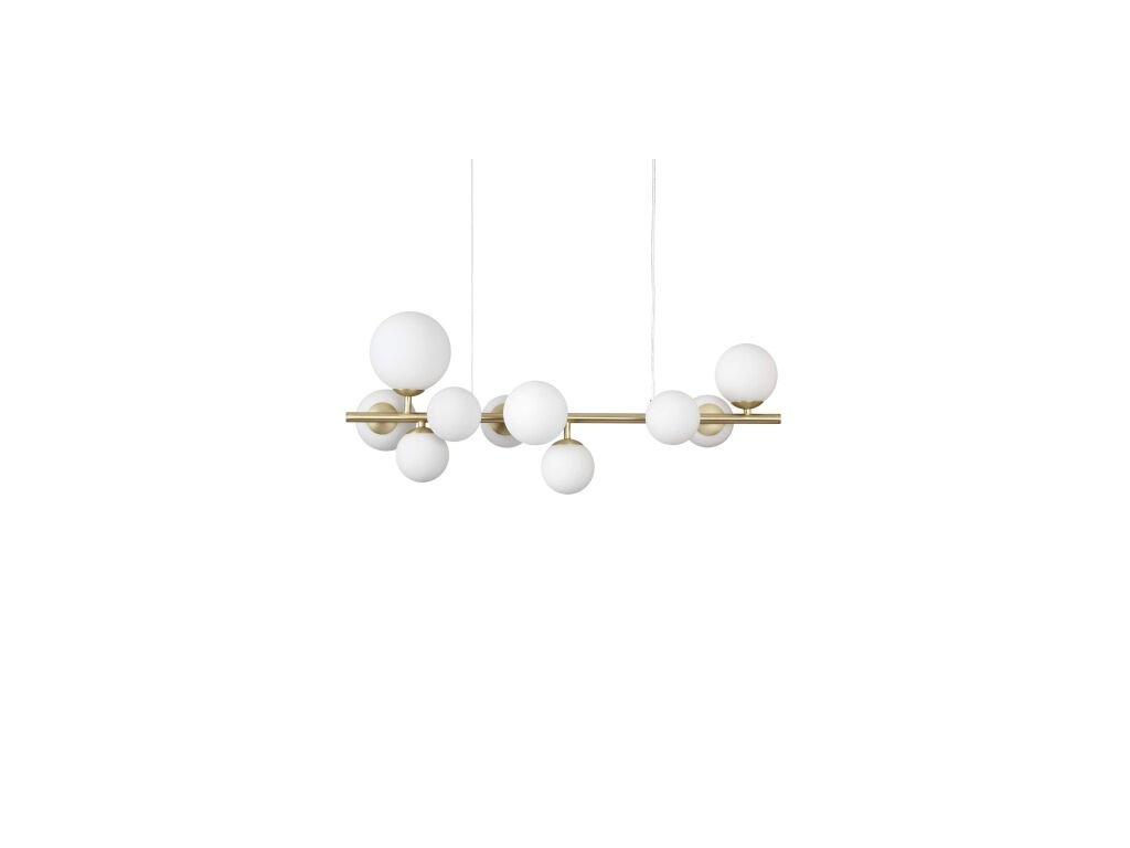 Elegance a ladnost - těmito slovy by se snadno nechal popsat stropní závěsný lustr Perlage. Na tenkých lancích je od stropu zavěšená kovová kontrukce ve zlaté barvě, na kterou těsně přiléhají bílé skleněné koule. Díky tomu, že lustr nejlépe vynikne v dostatečném prostoru, doporučujeme jeho instalaci do vzdušných místností s vyššími stropy.