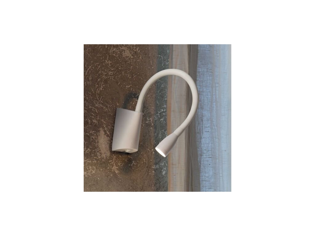 Nástěnné svítidlo s vlastním vypínačem umístěným zespodu na kovové základně v bílé barvě. Pružné silikonové rameno lze natočit dle potřeby.