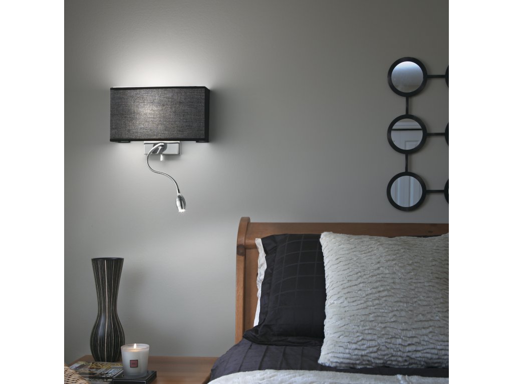 Nástěnné svítidlo Hotel v klasickém designovém provedení. Vhodné je pro použití v ložnici jako hlavní světlo + čtecí lampička. Můžete jej tedy využít hned dvakrát. Jedno stínítko, potažené látkou a zespodu i shora zakončeno matným sklem, poslouží k osvětlení místnosti a druhé svítidlo si můžete libovolně natočit a osvětlit tak určitý bod, ideálně knihu, časopis atd.