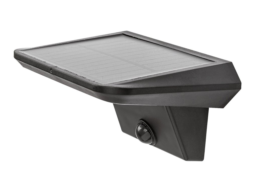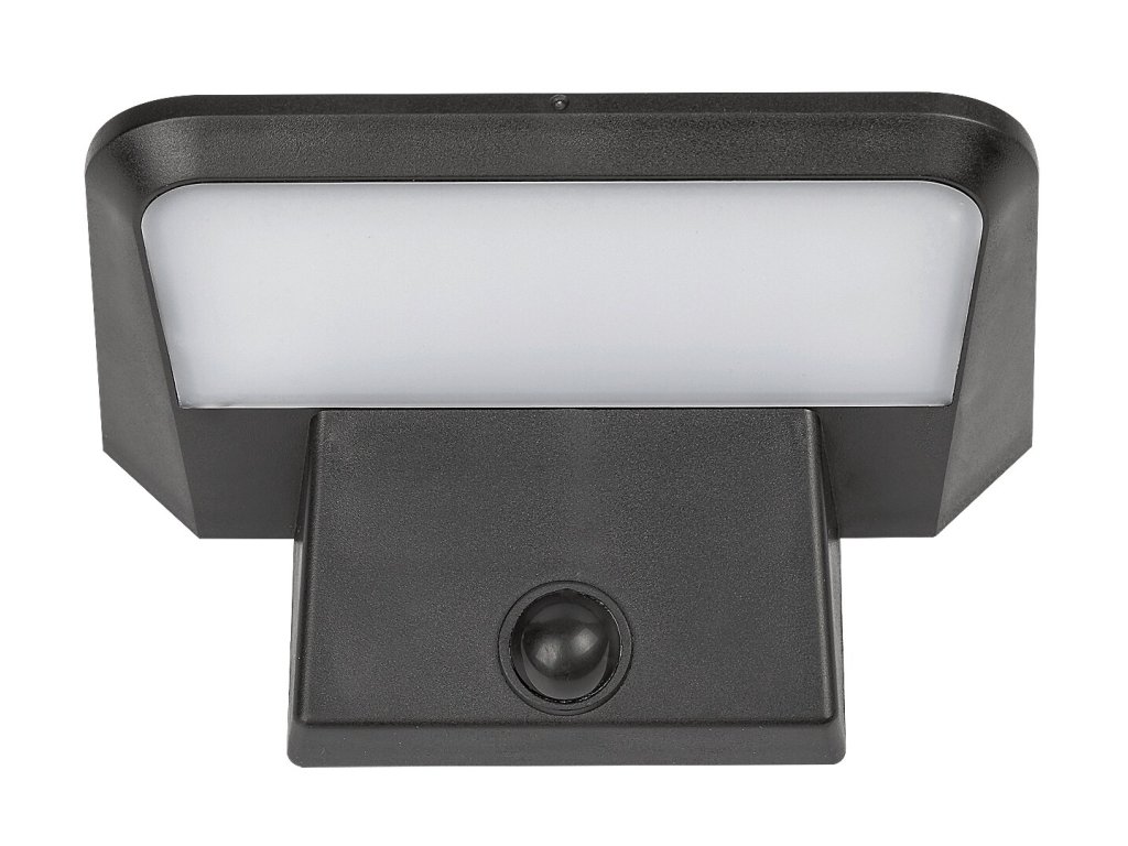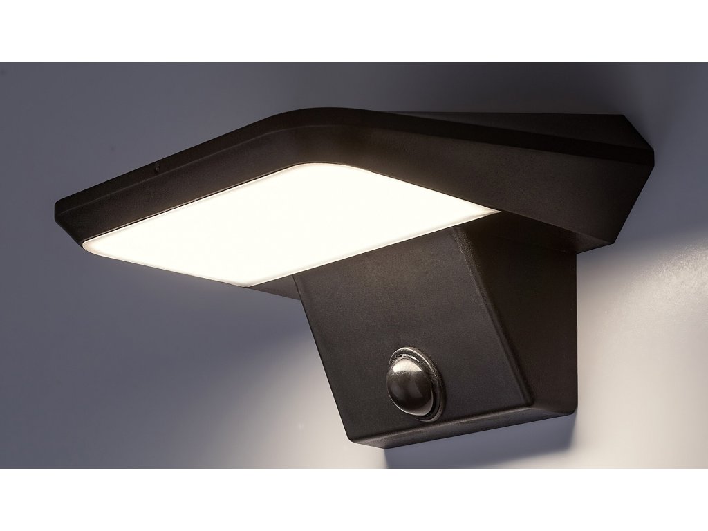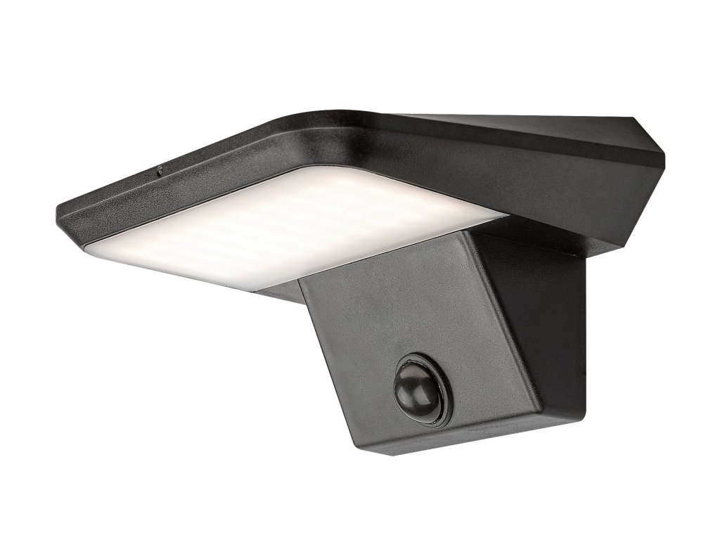 Venkovní nástěnné svítidlo Qesa s čidlem pohybu a solárním panelem. Svítidlo je vhodné k osvícení chodníků kolem domu. Svítidlo svítí směrem dolů. Je vyrobeno z černého plastu s bílým stínítkem.